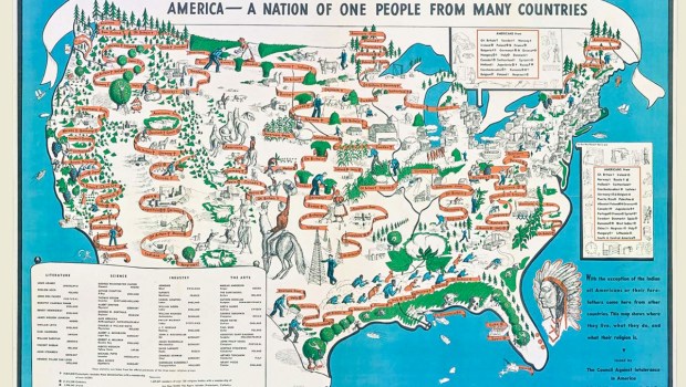 This unusual rendering was created to remind us where we came from In the years leading up to the Second World War, there was a particularly strong suspicion of immigrants among Americans. As a response, a New York based organization called the Council Against Intolerance commissioned a map in 1940 by an illustrator named Emma Bourne. It was called “America — A Nation of One People From Many Countries,” and its purpose was to remind people that, with the exception of the Native American, all Americans or their immediate ancestors came from other nations. Atlas Obscura shares the story: