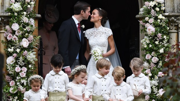 Pippa Middleton (centre R) kisses her new husband James Matthews, following their wedding ceremony at St Mark’s Church in Englefield, west of London, on May 20, 2017, as the bridesmaids, including Britain’s princess Charlotte (L) and pageboys, including Britain’s prince George (2R), walk ahead.