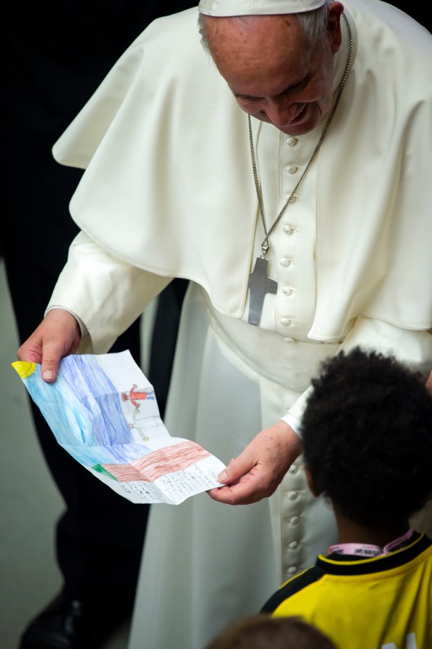 “In the general audience, we’ve spoken of the dialogue between the elderly, and” — indicating the child with his hands — “young people,” the Pope said with a smile.