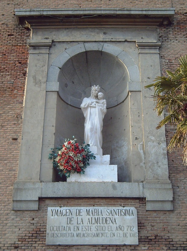 Other traditions explain that in 1083, when King Alfonso VI of León conquered Madrid and expelled the Muslims from the city, he became obsessed with finding a valuable icon of the Virgin Mary that centuries earlier had been hidden within the walls of the citadel for safekeeping. Unable to locate the lost figure, Alfonso VI devoted himself to prayer until a section of the walls collapsed and revealed the image, the candles with which it had been buried centuries before still lit. The site of the miraculous and legendary event is marked on the outside of the cathedral by a niche with a statue of the Virgin.