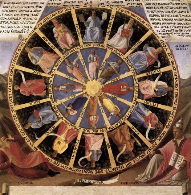 The first one depicts the vision of Ezekiel, one of the most vivid episodes in the Bible, from Chapter 1 of the Book of Ezekiel, where the ancient prophet sees four living creatures, each revealing a “wheel within a wheel.” Fra Angelico chose to represent the “wheel within a wheel” by showing two concentric circles, each representing key figures from the Old and New Testament.