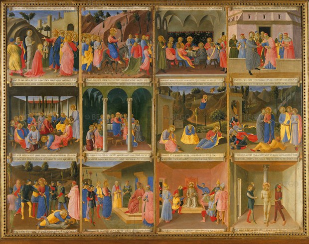 Fra’ Angelico, a Dominican friar and Early Renaissance painter described by art historian Giorgio Vasari as having “a rare and perfect talent,” decided to decorate the cabinet with 40 panel paintings, of which 35 have survived to our days. The panels, completed between 1451 to 1453, form one of the most narratively-rich artworks of the Renaissance. They represent different scenes from the life of Christ as well as allegorical scenes representing Christian doctrine. The first and last panel are the most symbolically rich of the series.