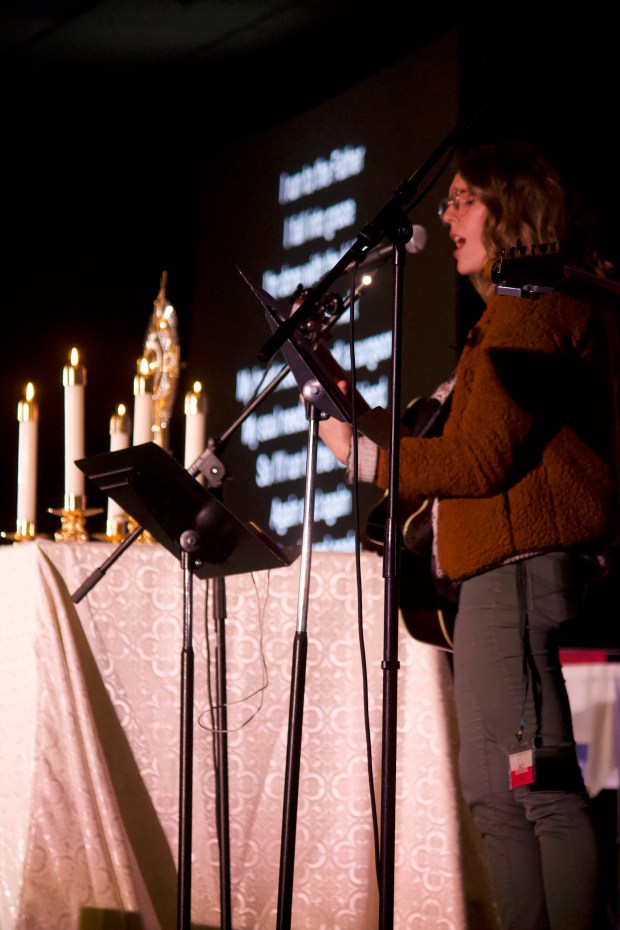 Among all the platforms for singing and playing guitar, her favorite setting remains Eucharistic adoration.