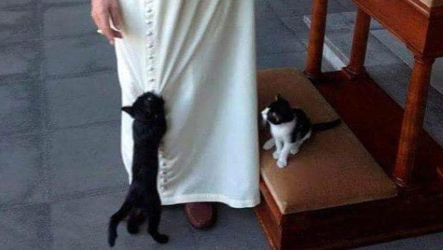 “Every time he met a cat, he would talk to it, sometimes for a long time…The cat would follow him. Once about 10 cats followed him into the Vatican and one of the Swiss Guards intervened, saying ‘Look, your eminence, the cats are invading the Holy See’.” – Cardinal Tarcisio Bertone
