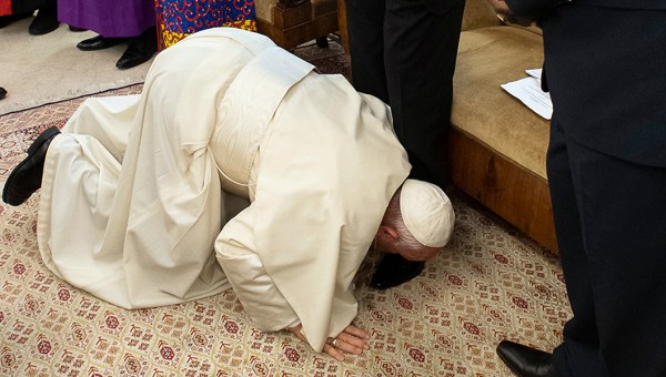 Pope Francis stuns rival South Sudan leaders by kissing their feet in plea for peace