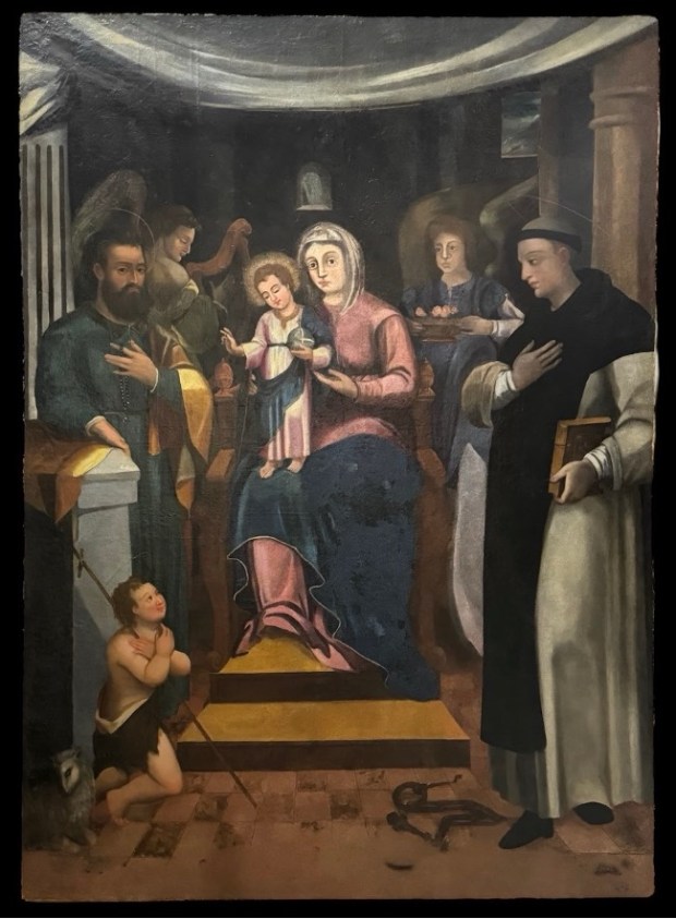 Originally this painting was located in the chapel of Our Lady of Grace, but when Grand Master Fra’ Hugues Loubenx de Verdala donated a new titular, this painting was placed on an altar at the side of the same chapel, and later it was taken to the chapel of the Assumption. Since this painting was highly regarded, it was placed on the high altar. Another oval painting depicting the Assumption of Mary was placed above that of Our Lady of Grace. In 1860, a wooden decorative baroque frame that was located in an old chapel of Our Lady of the Annunciation was brought to the chapel of the Assumption and placed around the titular painting. As a result, the oval painting depicting the Assumption was removed. For more than a hundred years, there was no painting on the high altar representing the title of the chapel.