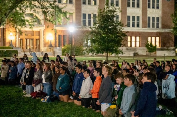 Hundreds of students were worshiping Jesus in the Eucharist — sitting or kneeling, joining in prayerful song, or adoring quietly.