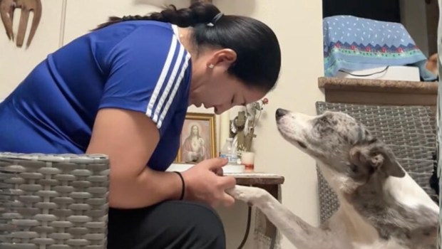 As the woman sits on her sofa, holding her rosary beads, she lovingly beckons Bruno to come and pray. Without hesitation, Bruno pads over, sits before her, and gently offers his paw — ready, it seems, to take part in this sacred moment.