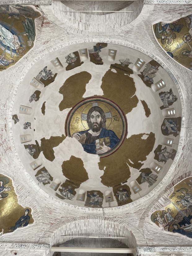 But nothing really prepares you for the interior. The mosaic decoration is one of the most beautiful of the 11th century. It belongs to the luminous school that treats light not as a natural phenomenon, but as a spiritual matter. The golden tesserae do not merely reflect the Attic sun: they transfigure it.