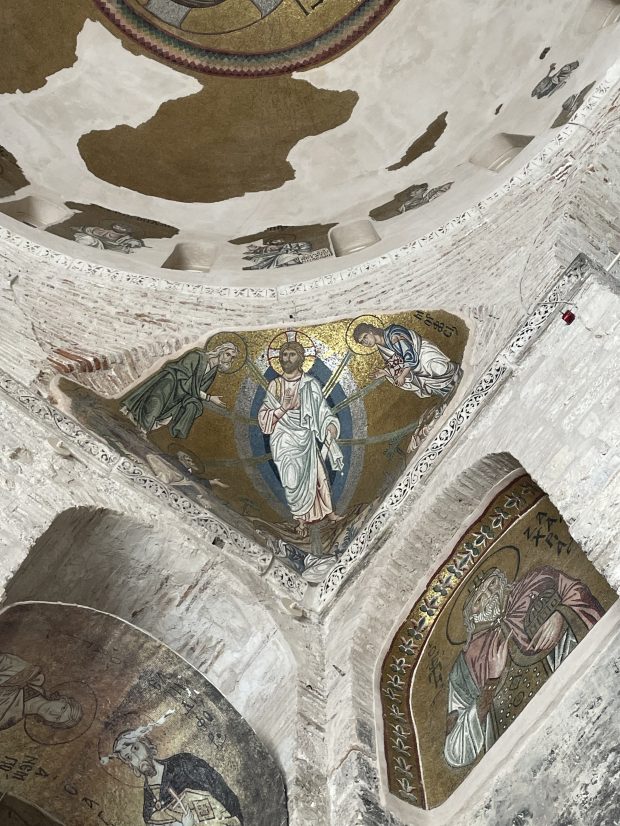 In the naos (the main nave), Christ Pantocrator dominates everything. His face is one of the most striking in all Byzantine art: severe, but imbued with an unfathomable gentleness; frontal, but open like a question addressed to the world; judge, but already savior. The gestures of his hands bless and teach.